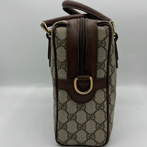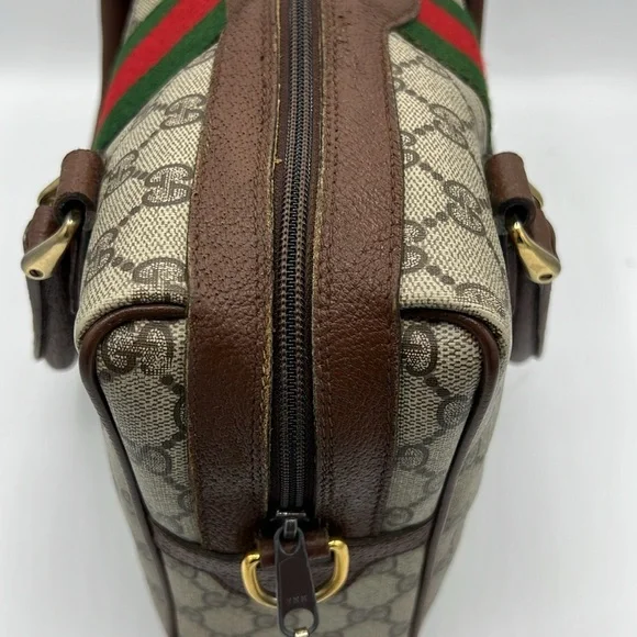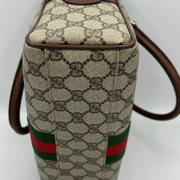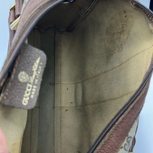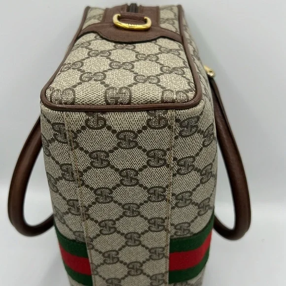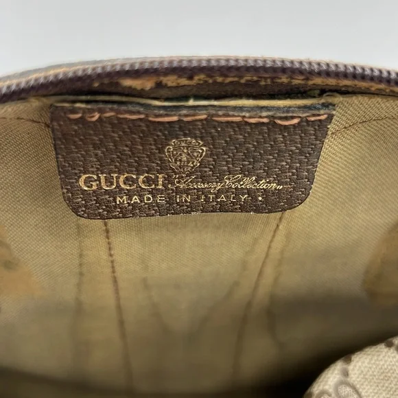 Gucci Accessory Collection - & Certificate of Authenticity Vintage- Exterior - Great condition; Interior- Fair conditionDescription:GG Supreme & Web AccentGold-Tone HardwareLeather TrimRolled HandlesZip Closure at TopIncluded: Brown Shoulder Strap- no Gucci stamping- see photoRed organizer- see photoPlease review all pictures and ask questions before bidding on this bag. Pictures show that interior lining has been removed from the bag. However, the Gucci tag and serial number is attached. Leather is brown and has wear. Brass is tarnished. Sold - As is