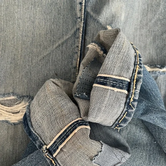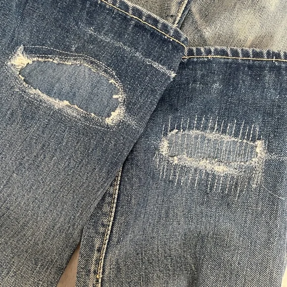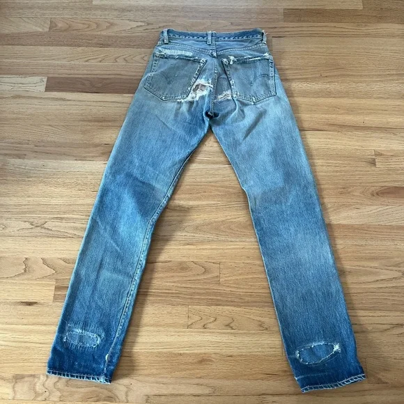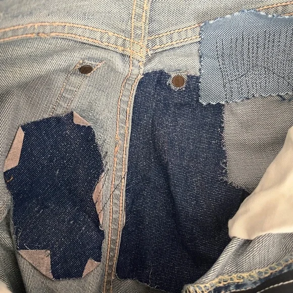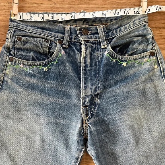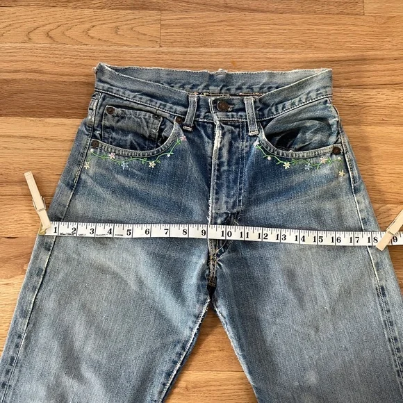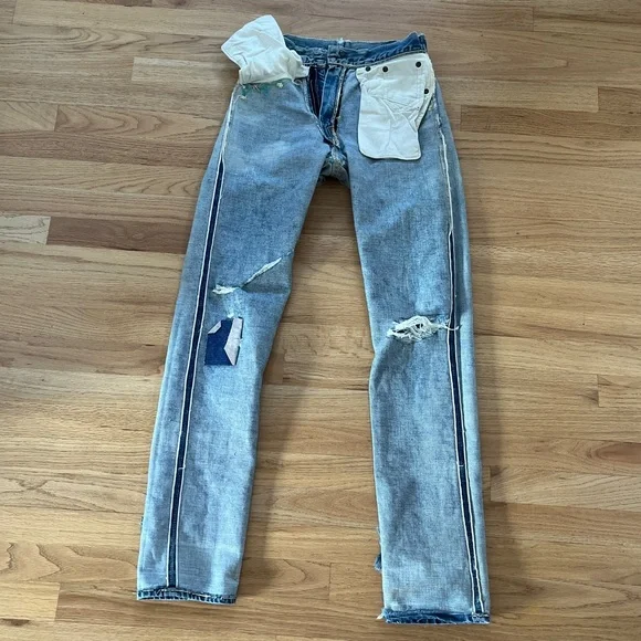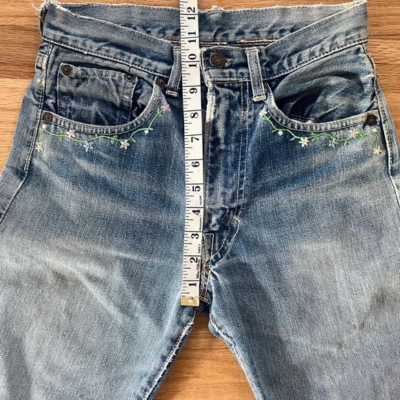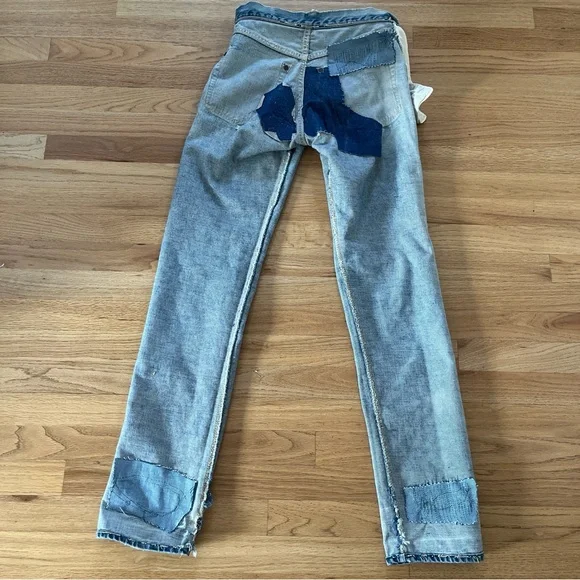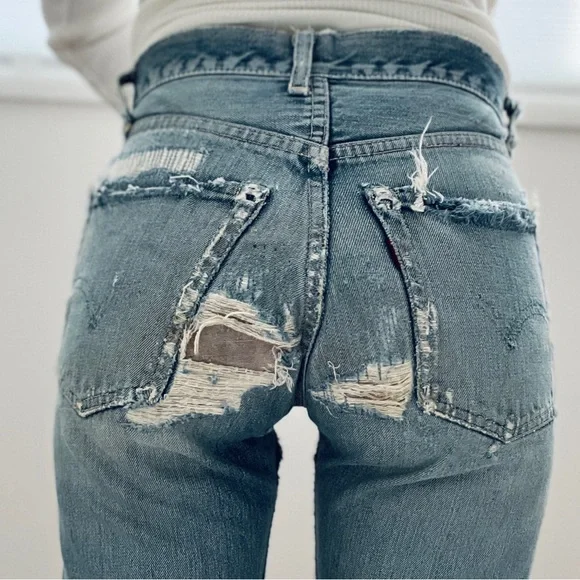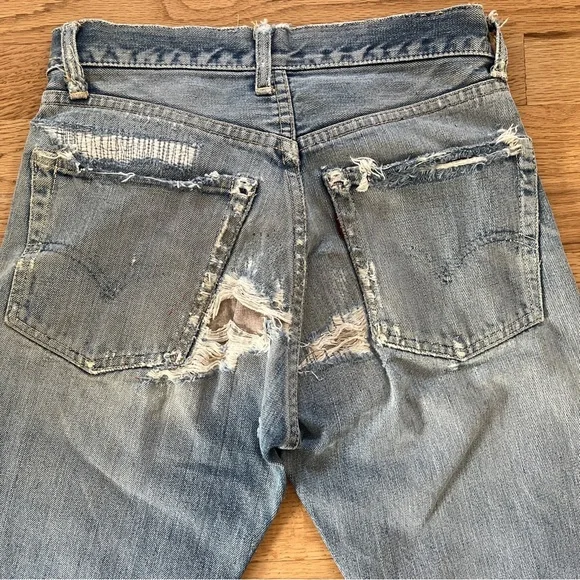 Vintage 60s Levi's 501 Z XX Redline Big Edenim jeansRare 1960s era redlines from my personal collection. These are the 501 Z zipper style with embroidery◾️Size: no tags, but fits like a size 25 (shown on me a size 25). Could fit a 24 to 26 depending on proportions and fit preferences◾️Condition: thrashed with fading, holes, repairs, and patches. Sold AS IS as I found them!◾️DM for questions or more photos, open to offers on all my items #distresseddenim #levis#bigE #redlines #vintagejeans Japan boho festival embroidery hippy Woodstock collectors selvedge